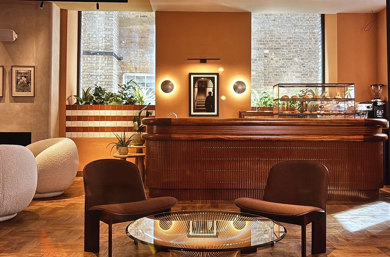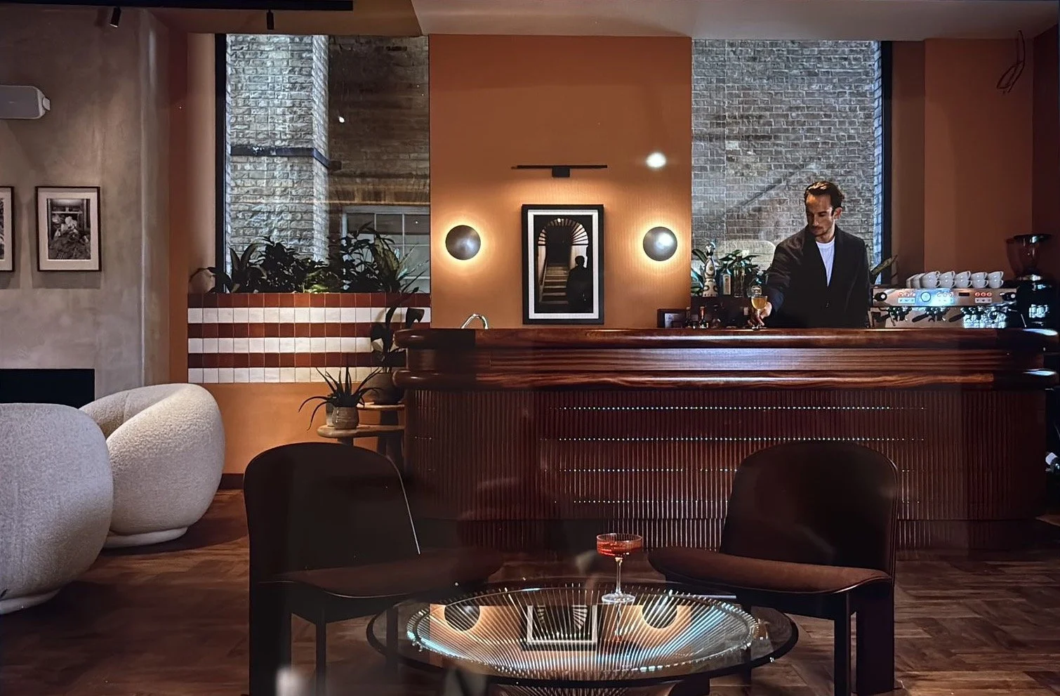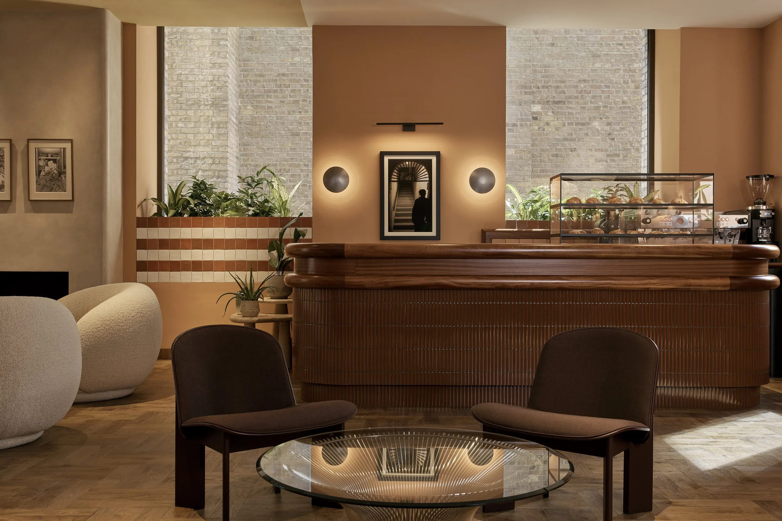 Mid-century-inspired modular sofas are arranged against veneered wall panels, complemented by soft, graphic lighting that enhances the intimate yet sophisticated atmosphere. A terracotta-tiled and marble staircase links this space to the lobby beyond, with its materials echoed in the chunky, lipped Sapelle lounge bar—a detail that runs as a recurring motif throughout the project.