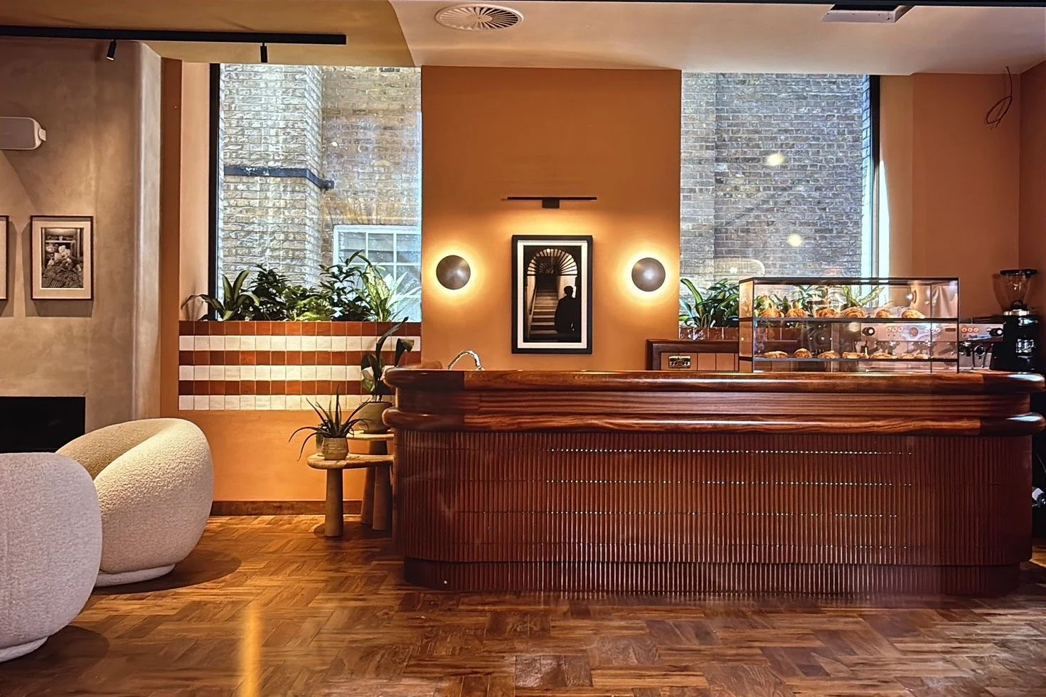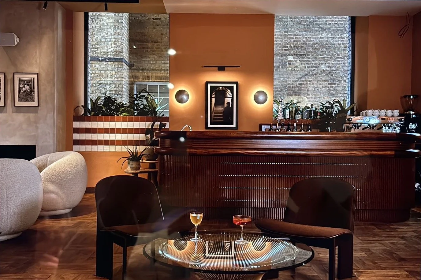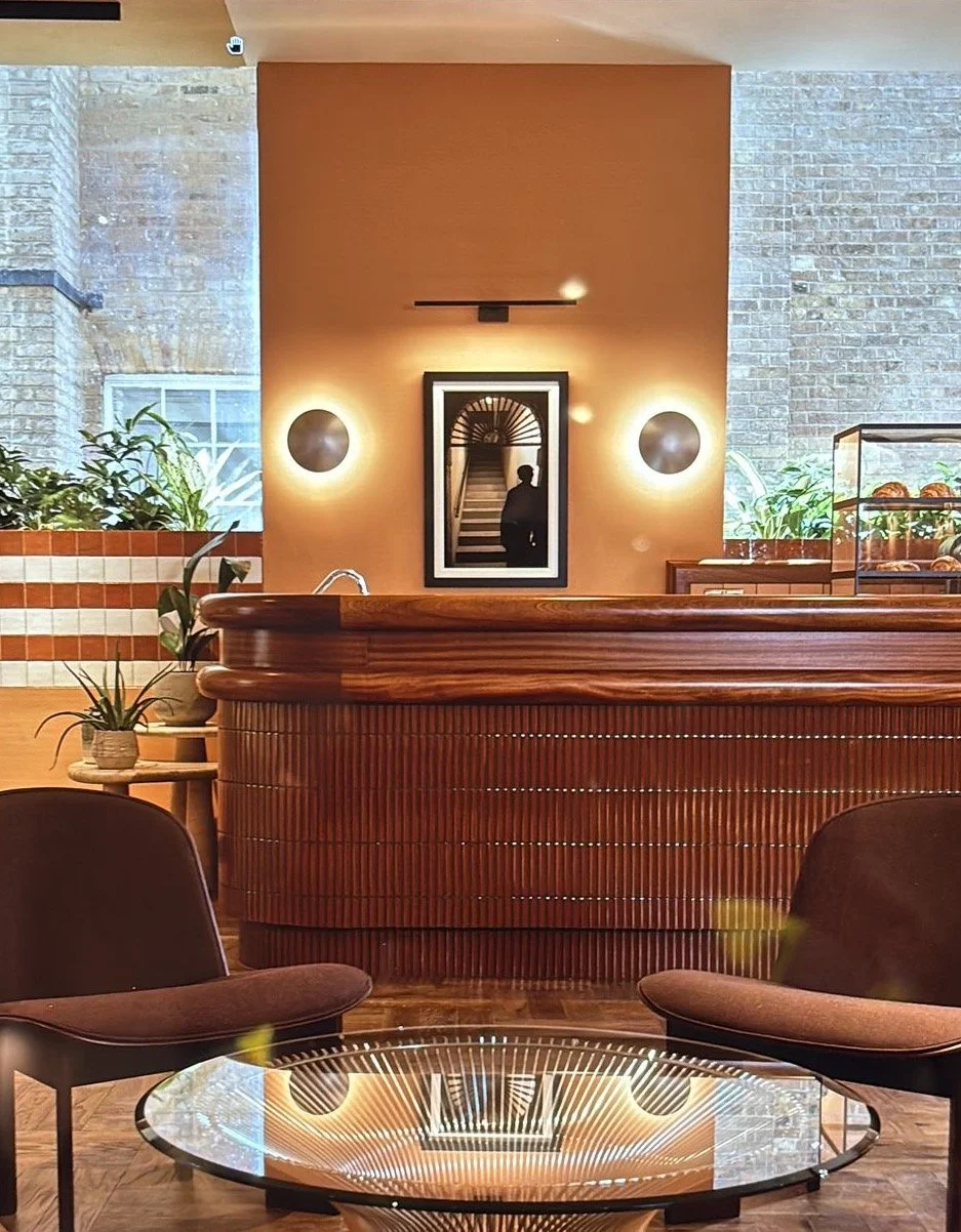 Mid-century-inspired modular sofas are arranged against veneered wall panels, complemented by soft, graphic lighting that enhances the intimate yet sophisticated atmosphere. A terracotta-tiled and marble staircase links this space to the lobby beyond, with its materials echoed in the chunky, lipped Sapelle lounge bar—a detail that runs as a recurring motif throughout the project.